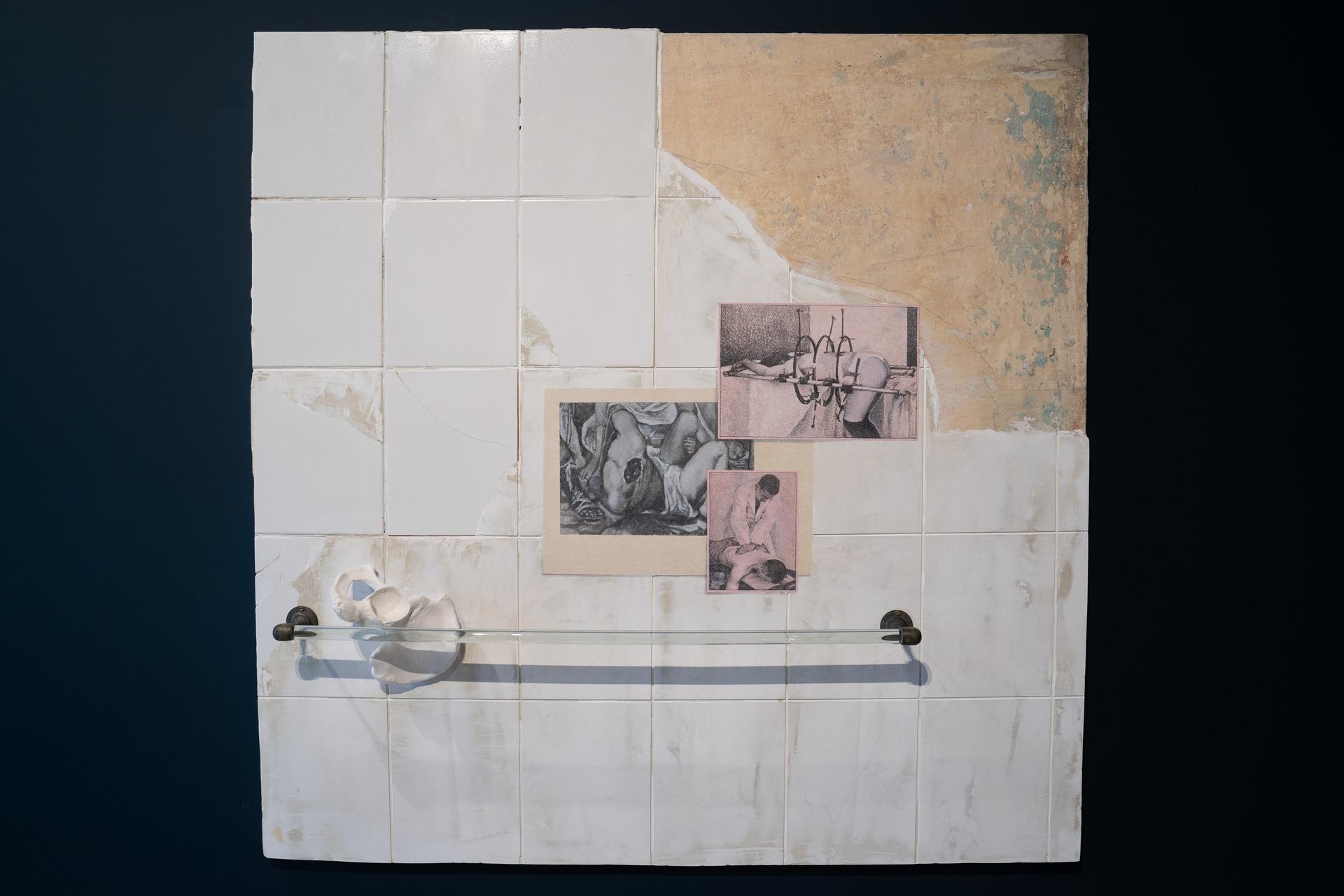 "Studium postawy", kafle, pasta akrylowa, pulment, pigment, plastik, metal, szkło, gips ceramiczny, transfer ścienny na papierze, akryl, gwasz, sklejka, 126 x 126 cm, 2023