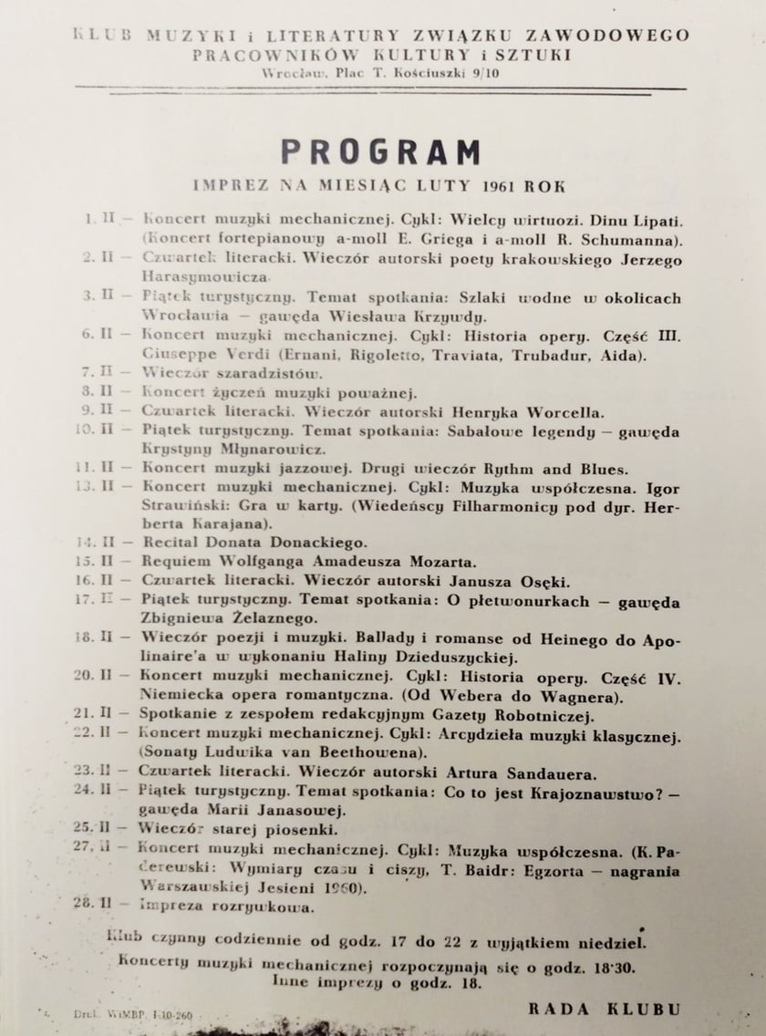 81 / 85 Wróć do artykułu Świątynia sztuki na placu Kościuszki 10! W Klubie Muzyki i Literatury bywali najwięksi [DUŻO ZDJĘĆ] Świątynia sztuki na placu Kościuszki 10! W Klubie Muzyki i Literatury bywali najwięksi [DUŻO ZDJĘĆ] fot. archiwum Klubu Przejdź do poprzedniego zdjęcia. Poprzednie Następne Przejdź do kolejnego zdjęcia. Klub Muzyki i Literatury – program Klubu Muzyki i Literatury w 1961 roku