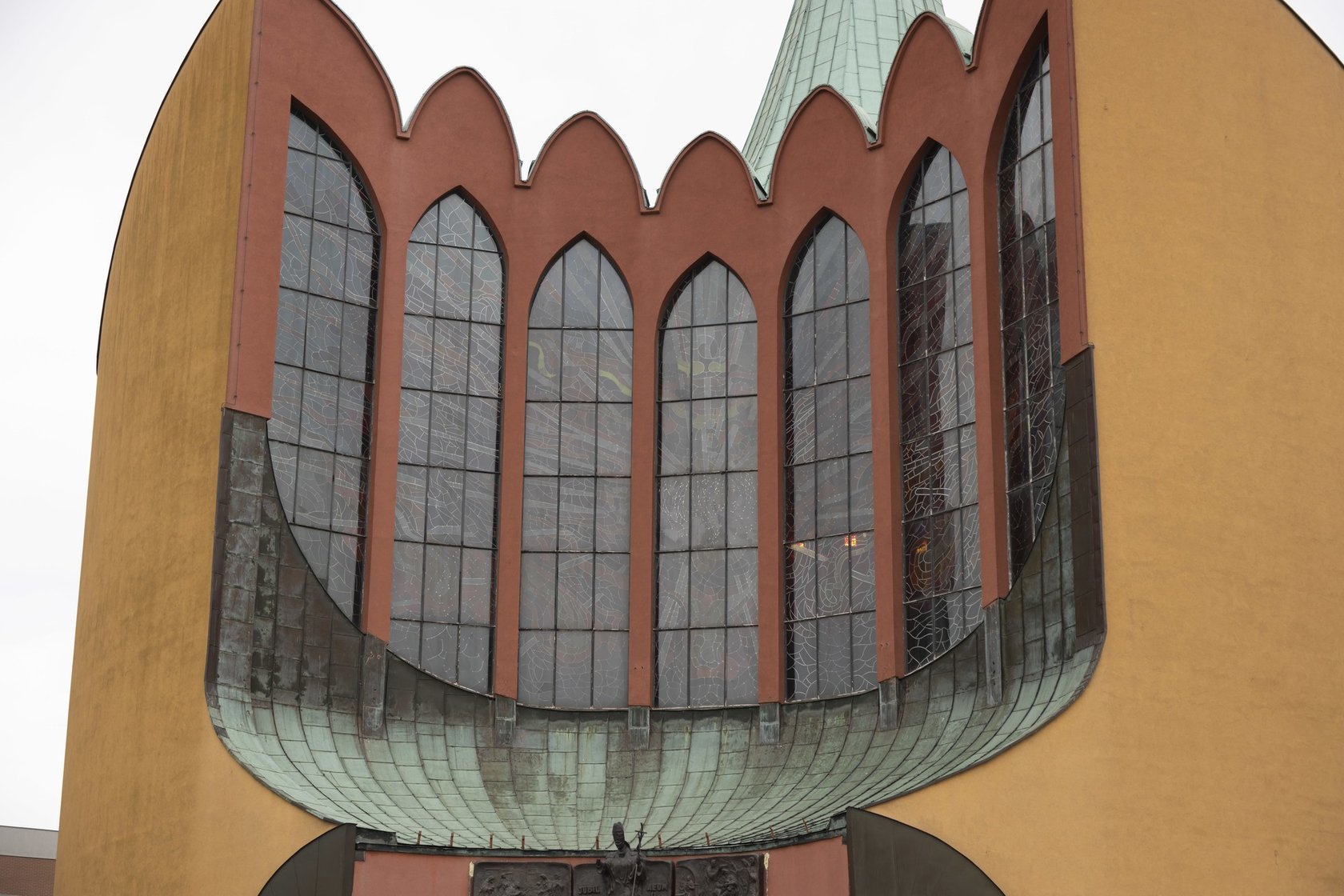 Okien w konchowej fasadzie jest siedem, co miało symbolizować dary Ducha Świętego. Po zmianie kolorystyki z bieli na ugier i sienę jest to jednak mniej czytelne, a kościół stracił wiele z obrazu narysowanego przez architektów (m.in. T. M. Zipser, który jest także autorem obrazu ołtarzowego).