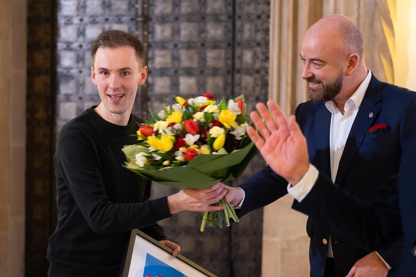 Nagrodę dla Artura Borkowskiego odebrał Mariusz Turchan. Gala wręczenia Arlekinów 2024. Wrocław, 27.03.2024