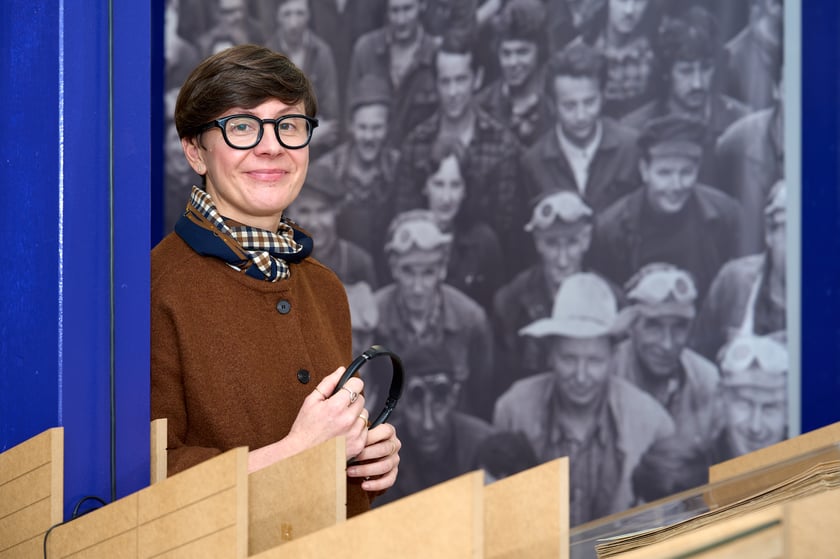 Agata Gabiś, jedna z kuratorek wystawy "Niedziela w Hutmenie" w Muzeum Architektury we Wrocławiu, w tle zdjęcie pracowników zakładu ze zbiorów Ossolineum wykonane przez S. Kokurewicza w 1975 roku