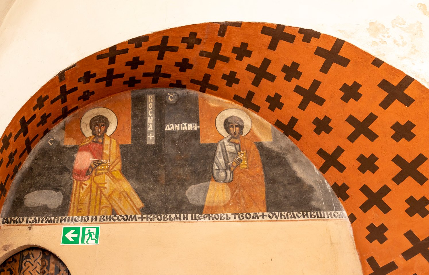Jerzy Nowosielski i Adam Stalony-Dobrzański, Św. św. Kosma i Damian, 1966, polichromia wnęki w ścianie kaplicy Podwyższenia Krzyża świętego, cerkwia przy ul. Mikołaja