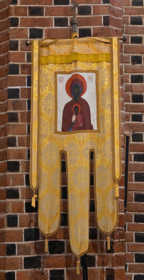 Jerzy Nowosielski, Bogurodzica w typie Wsiemiłostiwej z małym Jezusem-Emmanuelem-Logosem, chorągiew liturgiczna, lata 80. XX w.