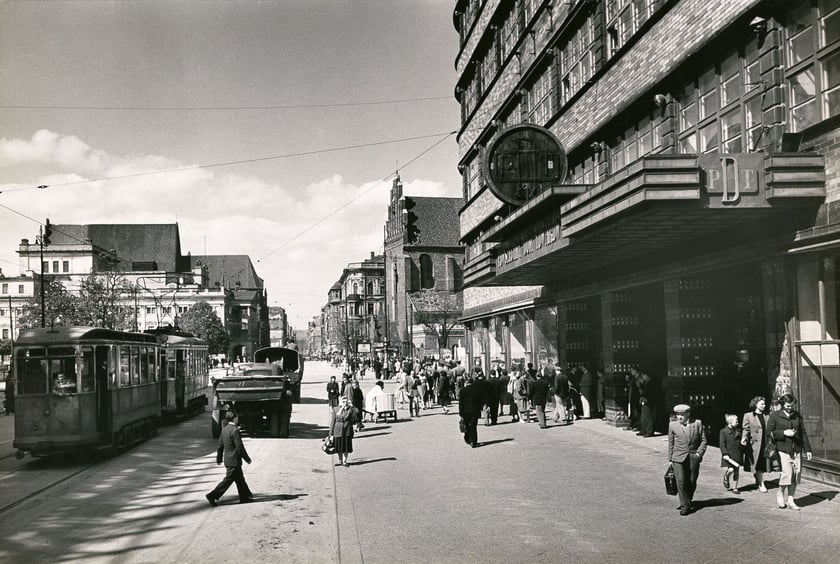 Wrocław, ul. Świdnicka przy PDT w kierunku Rynku (Stalingradzka, tramwaj, ciężarówki, piesi), 1955?