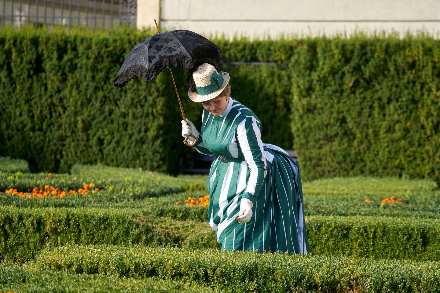 Edyta Herczyńska w ogrodzie Pałacu Królewskiego we Wrocławiu pozuje w sukni, jaką Panie nosiły ok. 1888 roku